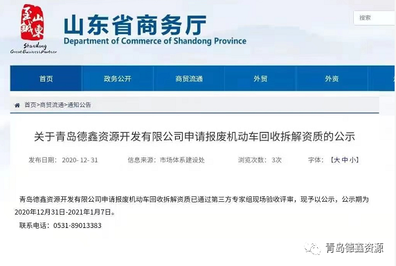 于2021年1月19日由山東省商務(wù)廳頒發(fā)報廢機動車回收拆解企業(yè)資質(zhì)認(rèn)定證書。
